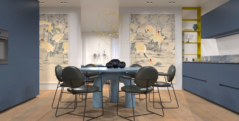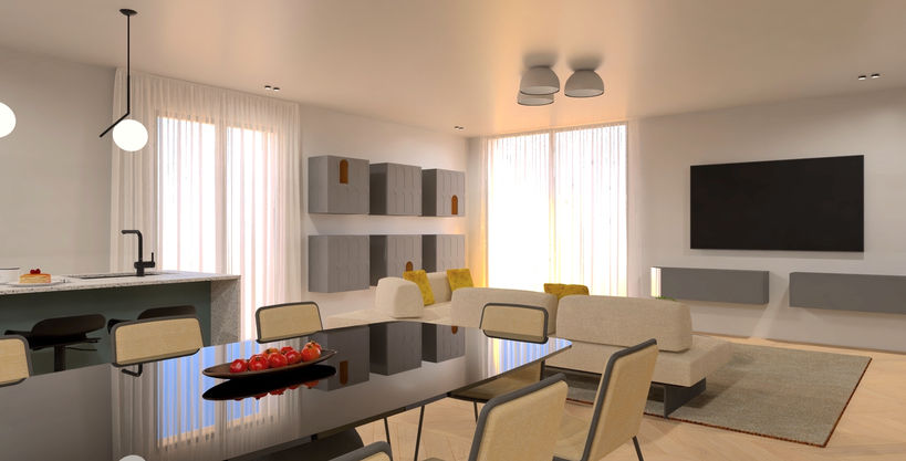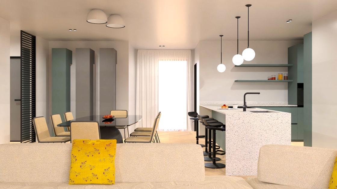 La spaziosa zona living con cucina open space è il cuore della casa, con accesso diretto a due ampie terrazze tramite porte finestrate a tutta altezza che illuminano l’appartamento.